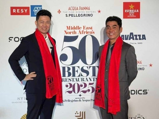 「MENA's 50 Best Restaurants 2025」授賞式にて、受賞シェフに贈られる赤いスカーフを肩にかける、エグゼクティブシェフ 行方 崇(左)と上田 寿夫(右)