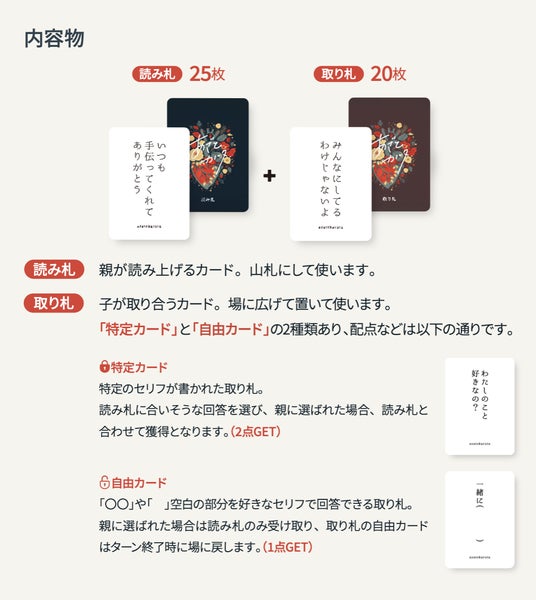 『あざとカルタ』は、お題(読み札)に対して最も"あざとい"回答をしたプレイヤーが勝利となるパーティーゲームです。 取り札には、誰でも"あざとく"なれるセリフの決まった固定カードと、自分で考えて自由に回答できる自由カードがあるため、大喜利系のゲームが苦手な方も得意な方も楽しめます。