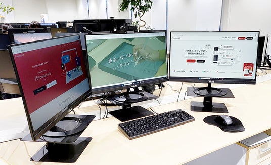 モニター台と昇降可能なデスクチェアによって、画面の上端を眼の高さに揃えるよう各々が調整。疲れにくい作業環境の実現に努めています。