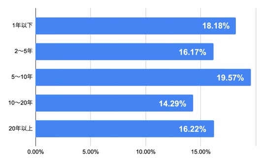 「2~5年」「10~20年」「20年以上」といった中堅~ベテラン層では、いずれも16%前後でおおむね横並びです。