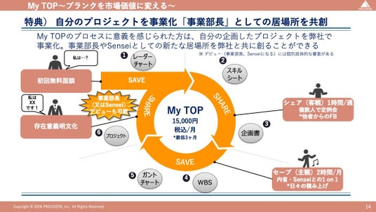 My TOP最大の強みは、今まで自分のスキルや経験を活かせる場所が見つからず、居場所がないと感じていた方に、PROUDERS合同会社の事業部長としてデビューできる選択肢を用意していることです。自分の目標や夢をもとに、Senseiの伴走を受けながら企画をブラッシュアップ、プロジェクトとして実行。PROUDERSの事業として採択された場合、事業部長として居場所をつくる立場でデビューできます。