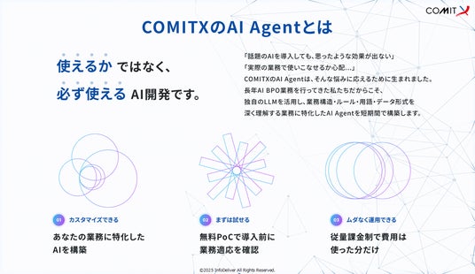 このたび、株式会社InfoDeliver(東京都千代田区、代表取締役会長兼社長:尚 捷、以下「InfoDeliver」)は、業務に特化したAI Agentをお客様と共に構築する新サービス『COMITX(コミットエックス)』の提供を開始しました。これにあわせて、サービスのコンセプト・機能・事例などを紹介するWebサイトを新たに公開いたしました。