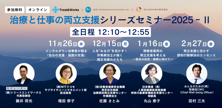 みんなのための株式会社(所在地:東京都練馬区、代表取締役:田村里佳)は、株式会社トリートエンドワークス(所在地:東京都渋谷区、代表取締役:藤井将光)と一般社団法人MHCリサーチ&コンサルティング(所在地:東京都港区、代表理事:田村三太)と共催で「治療と仕事の両立支援シリーズセミナー」を2025年11月26日、12月15日、2026年1月16日、2月27日(全日程:12時10分~12時55分)にオンライン開催いたします。