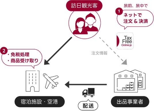 訪日外国人旅行者が、日本滞在中にスマートフォンやPCで日本全国の商品を免税価格で購入し、宿泊施設や空港で受け取れるECプラットフォームです。