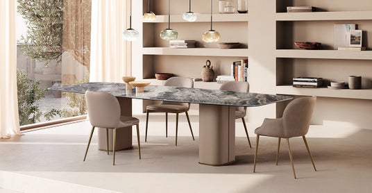 美しい曲線を描くレザー張りのウッドベースが目を引く「Milos(ミロス)」テーブル。丁寧にカーブ加工された木製構造に、職人の手によってレザーが美しく巻き付けられ、まるで彫刻のような存在感を放ちます。ベースを支えるメタルプレートは、仕上げのバリエーションも豊富に用意されています。天板は、ガラス、セラミック、大理石から選択可能で、ラウンド型・レクタングル型の両バージョンを展開。さらに、ラウンドタイプには回転式のレイジー・スーザンを組み合わせることもでき、機能性とラグジュアリー感を兼ね備えたダイニング空間を演出します。