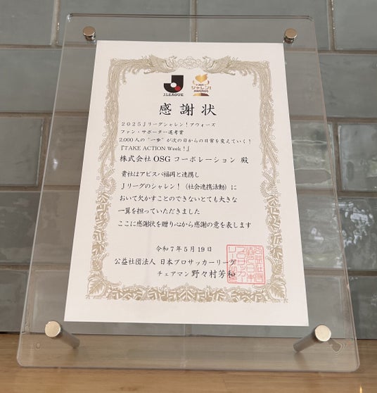 株式会社OSGコーポレーション(本社:大阪市北区、代表取締役社長:山田啓輔、以下「OSGコーポレーション」)は、Jリーグ全国60クラブが取り組む社会連携(シャレン!)活動の中から、特に社会に幅広く共有したい活動を表彰する「2025 Jリーグシャレン!AWARDS」において、アビスパ福岡が「ファン・サポーター選考賞」を受賞し、支援・サポートを実施したOSGコーポレーションの「ステハジ」プロジェクトも共に表彰されました。