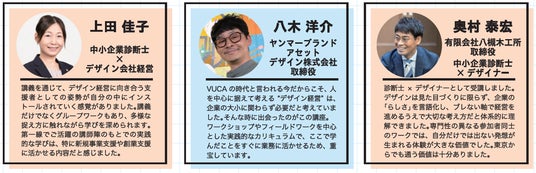 今後は、大阪だけでなく首都圏や他地域でも認定講座を実施していきます。大阪デザインセンターの支援事業の拡大に加え、「デザイン経営パートナー」の認定を受けた支援者による中小企業支援により、地域中小企業の活性化に貢献してまいります。