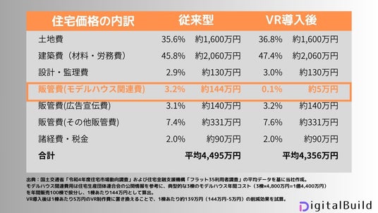 出典:国土交通省「令和4年度住宅市場動向調査」および住宅金融支援機構「フラット35利用者調査」の平均データを基に当社作成。モデルハウス関連費用は住宅生産団体連合会の公開情報を参考に、典型的な3棟のモデルハウス年間コスト(3棟×4,800万円=1億4,400万円)を年間販売100棟で按分し、1棟あたり144万円として算出。VR導入後は1棟あたり5万円のVR制作費に置き換えることで、1棟あたり約139万円(144万円-5万円)の削減効果を試算。