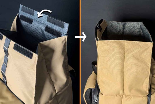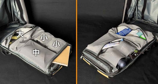 上部取り出し口はロールトップを採用しているので、引き上げると間口が大きく開 き、中の荷物を直接取り出すのも探すのも簡単。