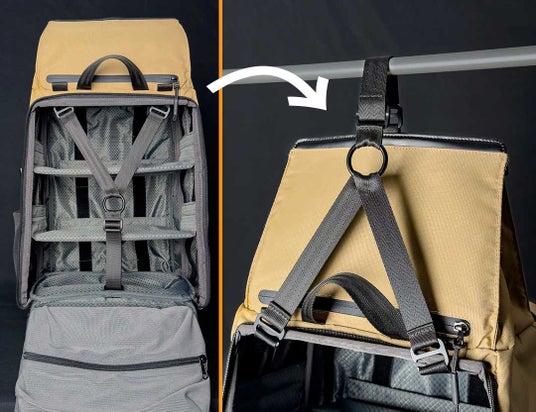 バッグを床に広げて荷物を散乱させることなく、クローゼットやハンガーラック、ス チール棚などに引っ掛けて荷物整理が可能に。