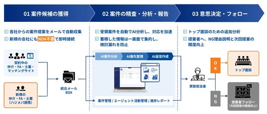 これにより、M&Aの買い手担当はコア業務であるM&A案件分析・社内調整・対外交渉に注力できるようになり、M&Aの成功確度向上を促します。