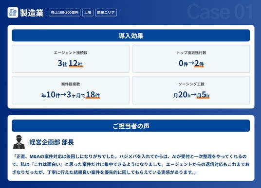 従来、新規のM&Aエージェントの開拓には各社ごとに数週間のリードタイムがかかっていましたが、本機能により即日でソーシング網を拡大できます。M&Aエージェントにとっても、ハジメバを通じて新たな買い手企業と接点が持てるため、双方にメリットのあるネットワーク構造を実現しています。