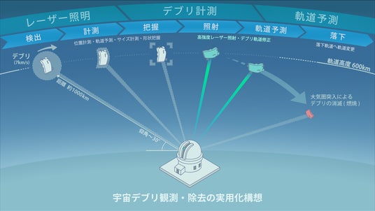 地上から高出力レーザーにより精密観測から照射制御までを一体化した次世代デブリ対処システムの実用化を目指します