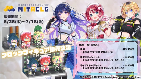 『PROJECT IM@S vα-liv(ヴイアライヴ)』は、『アイドルマスター』シリーズの新展開として始動した、視聴者が配信を通じてアイドル候補生をプロデュースする新感覚プロジェクトです。今回のコラボでは、登場キャラクター「灯里 愛夏」「上水流 宇宙」「レトラ」の3人を、 “空間ピクセル(ボクセル)”で立体化。高さ約5~6cmの手のひらサイズで再現したブロックフィギュアとして登場します。付属の3Dオンライン設計図を使えば、ブロック遊びが初めての方でも直感的に組み立て可能。完成したフィギュアは、小物と組み合わせたりと、自由なアレンジも楽しめます。