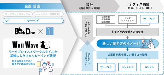 単に働く空間として捉えられていたオフィスを従業員のウェルビーイングを醸成する場所に変化させ、お客様の企業価値の向上に寄与することを目指します。加えて、Duck Diveは、ワークプレイスとワークスタイルを基軸に、従業員の働きやすさと働きがいを複合的に向上させ、企業の発展および成長に貢献いたします。