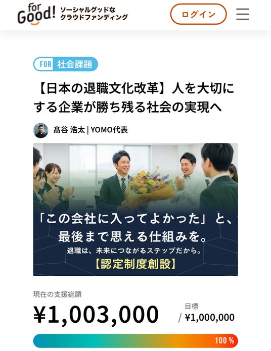 企業の人的資本経営への貢献、人材不足の解消を掲げる株式会社YOMOは、企業の退職改善に向けたクラウドファンディグに挑戦し、より多くの社会からの声を頂き達成しました。