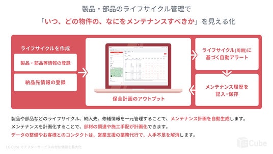 「LC-Cube」は、設備機器に関する保全計画の自動生成・更新機能を備えた予防保全支援・保全営業管理ができるクラウドサービスです。従来の「事後対応」や「属人的管理」から脱却し、「予防保全」および「情報の見える化」を実現。設備機器の納品時に提示される保全計画をクラウド上に資産化し、「いつ・どの物件で・何を」メンテナンスすべきかを一目で把握できるようになります。