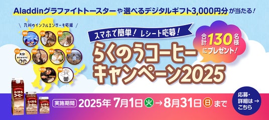 対象商品「らくのうコーヒー200ml・500ml・1000ml」を購入後、そのレシートを撮影して特設サイトから応募すると、抽選で30名にアラジン グラファイトトースターや100名に3,000円分のデジタルギフトが当たります
