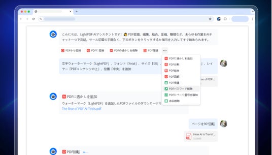 LightPDFは、AI技術を活用し、学習やビジネスの効率化を目指した総合的なPDFドキュメント処理ツールです。最近、新たに「AIスマートアシスタント」を導入し、AIとの対話で複数のPDF編集タスクを一度に処理可能になりました。これにより、ユーザーは作業の手間を大幅に削減できます。さらに、LightPDFはPDF翻訳、AIによるPDF生成、PPT自動作成など、多彩なAI機能も提供しており、幅広いニーズに応えています。