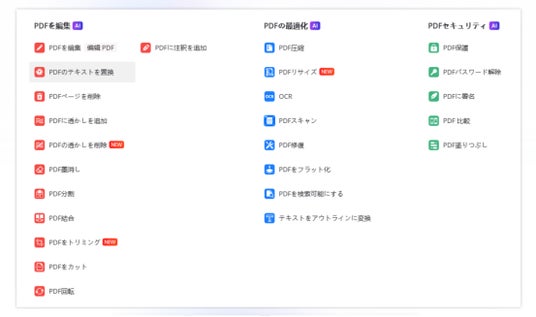 ・ 形式変換や文字の置換、ページ削除、分割など、基本的な編集機能も幅広くサポート。