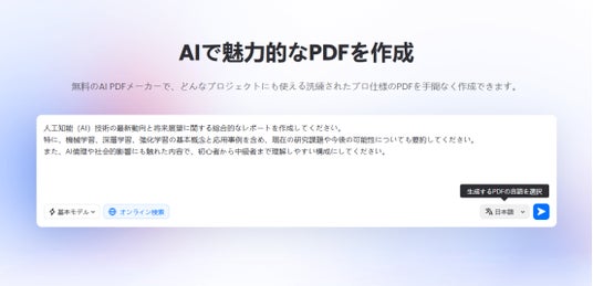 ・ キーワードや文章を入力するだけで、AIが内容に沿った高品質なPDFファイルを自動生成。