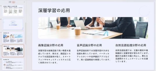・ テーマや要望を指定すると、AIが自動で構成やデザインを行い、美しいプレゼンテーション資料を短時間で作成。