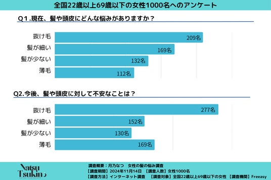 277名が抜け毛、152名が髪が細い、130名が髪が少ない、169名が薄毛の悩みがあると回答。