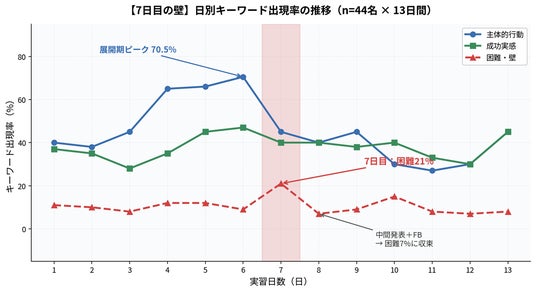 1.「7日目の壁」──プロジェクト開始4~6日目に主体的行動がピーク(70.5%)に達した直後、7日目に「困難」キーワードが21%まで急上昇。8日目の中間フィードバックで7%まで収束します。誰が声をかけるかで定着が決まる分岐点であることが判明しました。