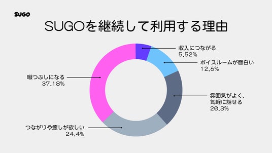 約38%のユーザーが「時間つぶし」や「癒し」を目的に、SUGOを継続利用していることが明らかになりました。