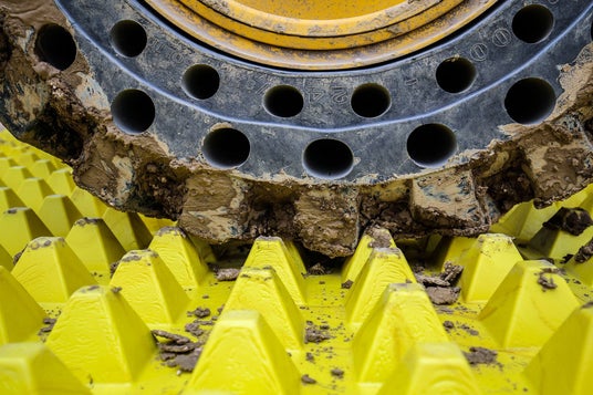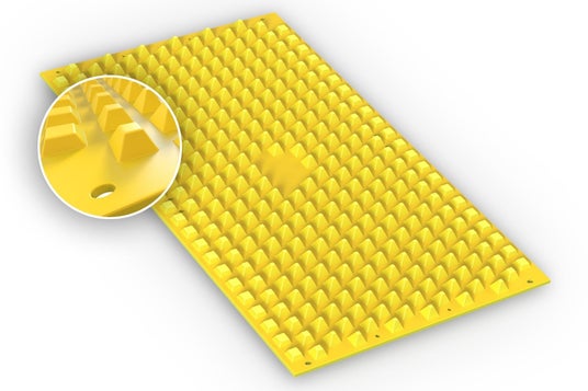 FODSマットは、入退場口に敷設する乾式のトラックアウト対策資材です。マット表面に配置されたピラミッド状突起が、車両通過時にタイヤ溝をわずかに変形させ、付着した泥や堆積物、異物を物理的にかき出す構造*¹を採用しています。