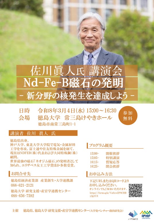 徳島県及び徳島大学は、ネオジム磁石(Nd-Fe-B磁石)の発明者として知られる佐川眞人氏をお招きし、特別講演会を現地及びオンラインで開催します。