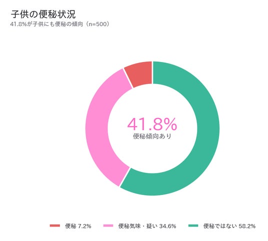 子供の便秘状況についても調査したところ、「便秘」(7.2%)と「便秘気味・疑い」(34.6%)を合わせた41.8%が子供にも便秘の傾向があると回答。親の食生活や運動習慣が子供にも影響している可能性が示唆されました。