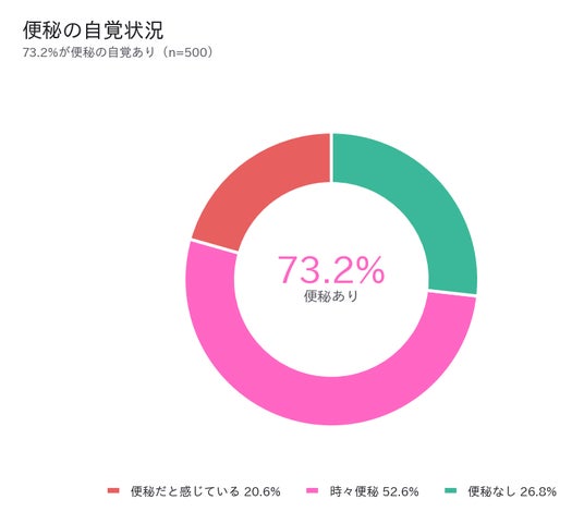 調査対象500名のうち、「便秘だと感じている」(20.6%)と「時々便秘になる」(52.6%)を合わせると、実に73.2%が便秘の自覚を持っていることがわかりました。便秘はもはや一部の人の悩みではなく、多くの人が日常的に直面する健康課題です。