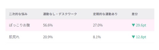 生活習慣との関連を分析すると、運動習慣の有無が二次的な悩みの発生率に大きな影響を与えていることがわかりました。