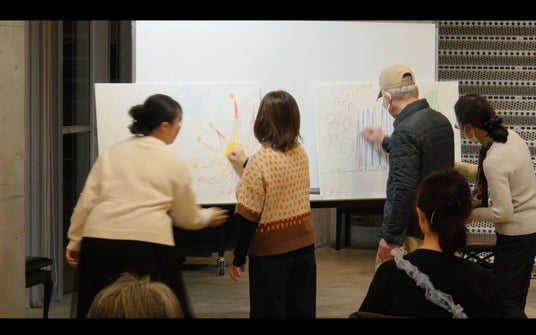 また、即興アートの時間では、壁一面に広がる色彩が「今ここにいる自分」を表現する手段となり、会場は楽しさあふれる笑顔と熱気に包まれました。