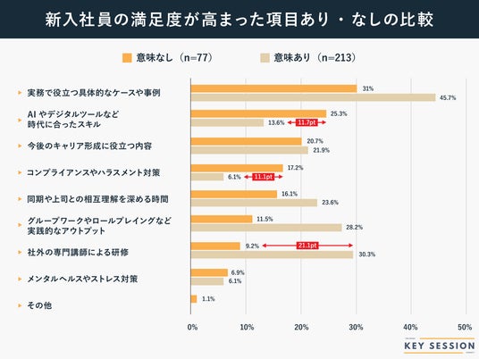 「AI・デジタル」といった現代的な内容や「コンプライアンス強化」といった基本的な内容については、意味なし層が上回っており、明確に差が生まれています。どちらも近年重要性が叫ばれるようになっており、「今の研修は時代遅れ」と感じた途端、研修の意味を感じられなくなる可能性があるといえるでしょう。