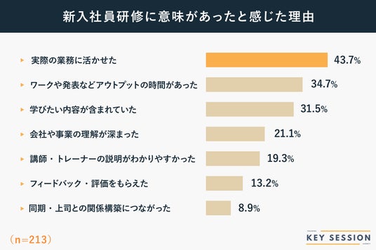 次点で「一方的な進行で参加しづらかった」が23.0%、「同期や上司との交流がなかった」が19.6%となっています。アウトプットの時間の少なさや交流の少なさも、「意味ない」と感じる一因となるようです。