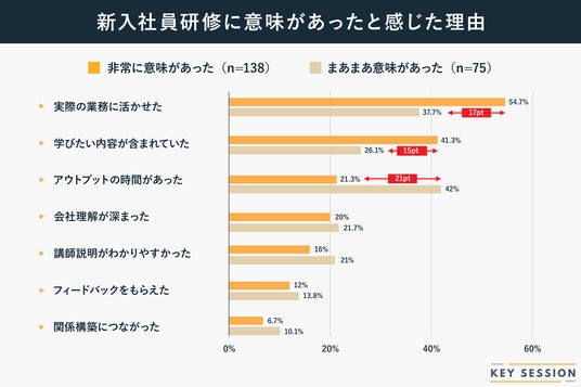逆に意味あり層だけが明確に高くなっているのが、社外の専門講師による研修で21.1ポイントの差分が生まれています。