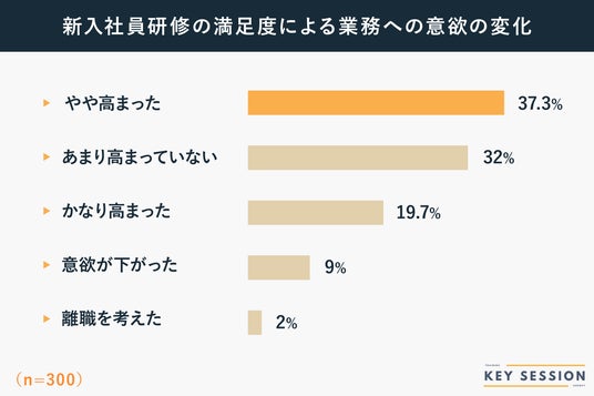 新入社員研修を受けたことによる業務意欲の変化については、やや高まったが約37.3%で最多となりました。