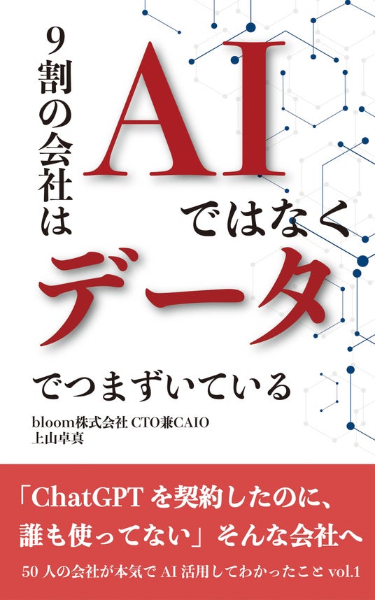 bloom株式会社(本社:東京都千代田区、代表取締役:林 栄吾、以下「bloom」)は、CTO兼CAIOの上山 卓真による書籍『9割の会社は"AI"ではなく"データ"でつまずいている ~50人の会社が本気でAI活用してわかったこと vol.1~』をAmazon Kindleストアにて出版いたしましたことをお知らせいたします。