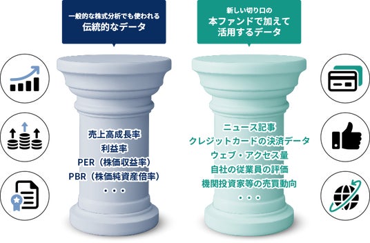 ・本ファンドの投資対象のETFでは、財務諸表などの伝統的なデータに加え、ニュース記事やウェブ・アクセス量などの新しい切り口のデータも活用します。