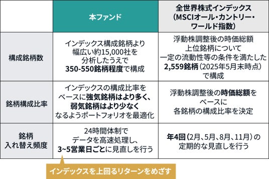 本ファンドは、様々なデータの活用やAI等を用いた分析により、長期的にインデックスを上回るリターン*をめざすアクティブ・ファンドです。