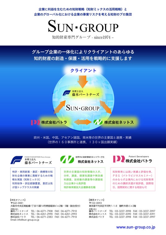 サン・グループは、弁理士法人藤本パートナーズ、株式会社ネットス、株式会社パトラの3社を中心とした知財総合支援グループです。大阪、東京を拠点に、出願・係争・評価・調査・分析・教育まで、知的財産に関するあらゆるニーズにワンストップで対応しています。