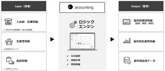 本サービスは、物流倉庫で利用されているWMS(倉庫管理システム)の稼働実績データを活用し、作業実績から生産性・採算管理、請求に必要な情報の算出までを一気通貫で行えるものであり、3PL事業者(倉庫業)や自社で倉庫・物流機能を保有する企業など、物流に携わる企業全般を対象とし、物流現場のデータを経営・請求業務にまでつなげることを目的としています。