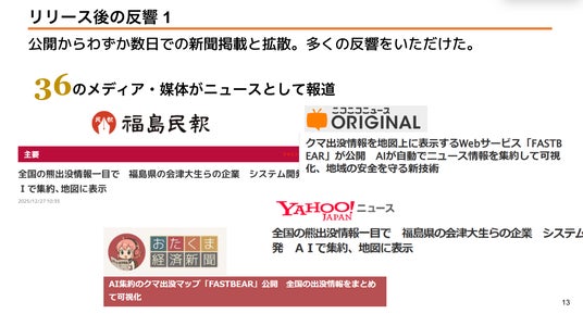FASTBEARは2025年12月26日の公開以降、わずか数日で全国紙・地方紙・Webメディアを含む36の媒体でニュースとして取り上げられ、クマ出没対策における新しい情報基盤として注目を集めています。