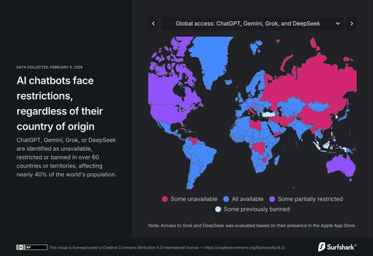 AIチャットボットは開発国に関わらず制限を受けていますChatGPT、Gemini、Grok、DeepSeekは60以上の地域で利用できない、あるいは制限または禁止されている状態であり、世界人口の約40%がその影響を受けています。