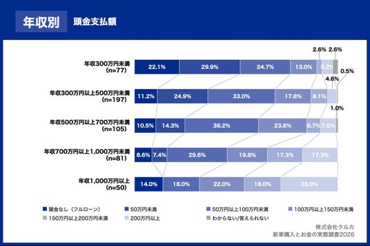株式会社クルカは、直近3年以内(2022年1月以降)に新車を購入し、購入時の意思決定に関与した方 1,076名を対象に、新車購入とお金の実態調査2026を実施しましたので、お知らせいたします。本リリースでは、年収別に見た「頭金・支払い方法の選択と家計意識の違い」を分析した結果をお知らせいたします。