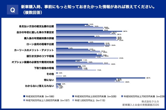 最後に、「新車購入時、事前にもっと知っておきたかった情報があれば教えてください。(複数回答)」の質問では、年収帯によって求める情報に違いがあることが分かりました。