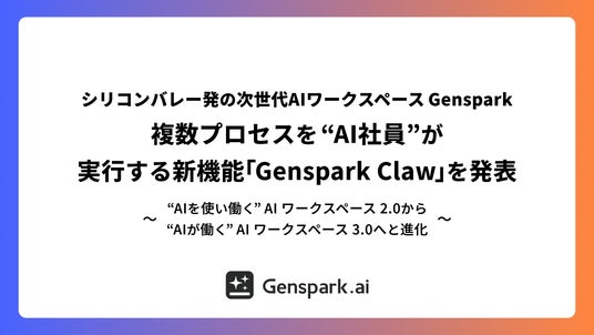 シリコンバレー発の次世代オールインワン AI ワークスペース「Genspark (ジェンスパーク)」は、複雑な業務プロセスを “AI社員” が実行する新機能「Genspark Claw (ジェンスパーク・クロー)」を含む AI ワークスペース 3.0を発表します。合わせて、プロダクトローンチ後11ヶ月でARR (年間ランレート) が2億ドルを超え、シリーズBラウンドが、Emergence Capital史上最大の投資を含む、3億8,500万ドルに拡張されたことをお知らせします。