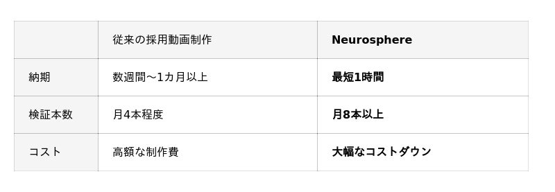 NeurosphereのAIは、採用動画を最短1時間・大幅なコストダウンで制作します。同一の採用シーズン内に、従来の2倍以上のクリエイティブを投入・検証することが可能です。